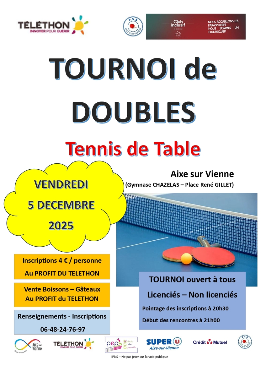Rendez-vous le vendredi 5 décembre au gymnase Chazelas à Aixe/Vienne pour un tournoi en double dans la bonne humeur et la convivialité. Ouvert à toutes et tous, licenciés ou non licenciés.